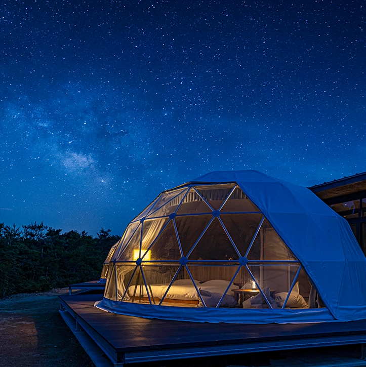 高規格設備 2タイプのドーム型テント7棟のドーム型テントは、広々としたデッキスペースを備えたプライベート空間が魅⼒的。冷暖房完備のドーム型テント内には、シングルベッドを2台とエキストラを備え、4名までゆったりとお泊まりいただけます。お部屋は「スタンダードドーム」とスマートTV付きの「デラックスドーム」の2タイプよりお選びいただけます。快適なドーム型テントでのグランピングをご体験ください。