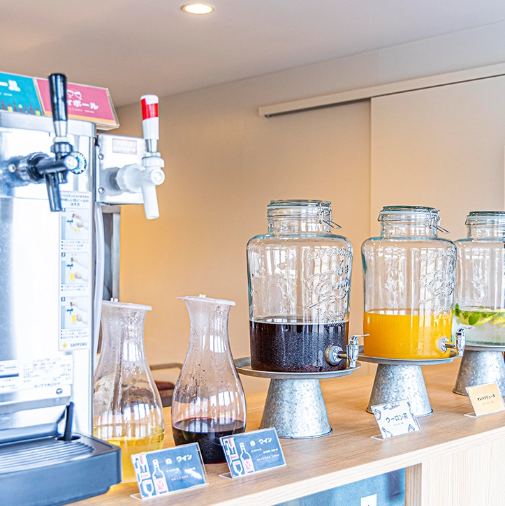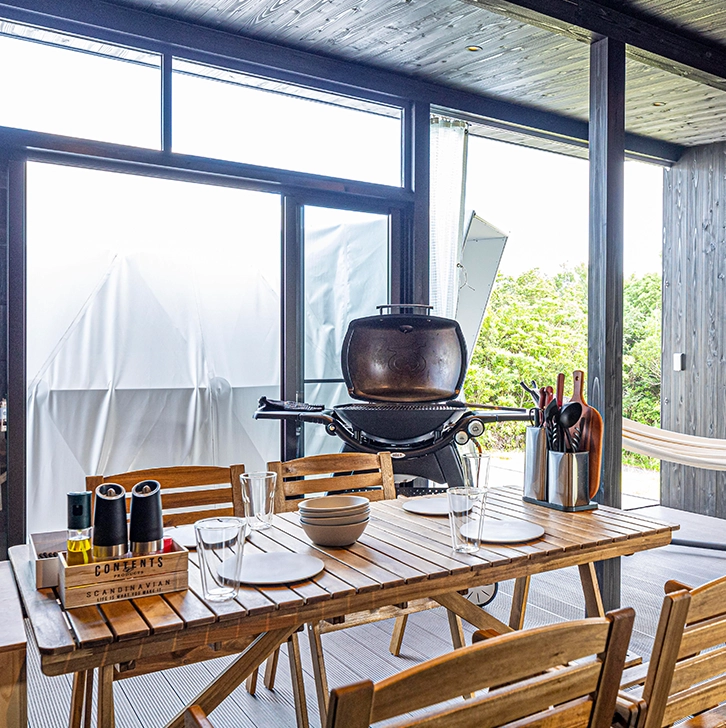 客室内バスルーム・トイレ・食事スペースオールシーズン・全天候型でグランピングをお楽しみ頂けるよう、各グランピングテントのすぐ側に、建物型の⾷事スペースをご⽤意。⾬天でも安⼼・快適にBBQをお楽しみ頂けます。お箸や⾷器類などもご⽤意しておりますので、お持ち込み頂いた⾷材でオリジナルのBBQにもチャレンジできます。また、各テントごとにトイレ・バスルームを併設。⼥性や⼩さなお⼦様でも安⼼してご利⽤いただけます。どなたでも気軽に快適なグランピング体験をお過ごし頂けます。